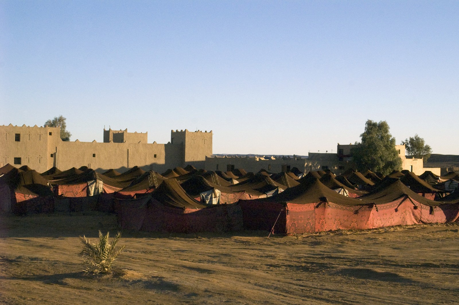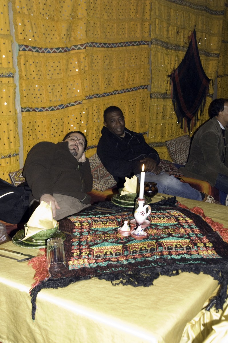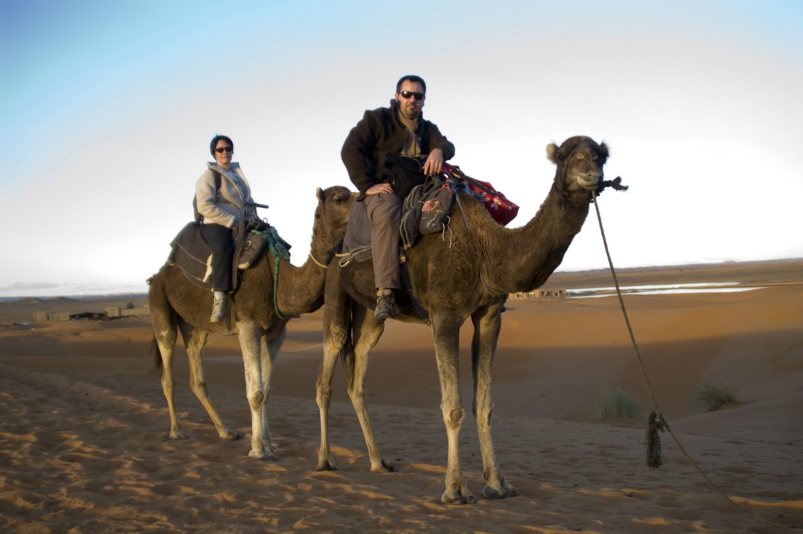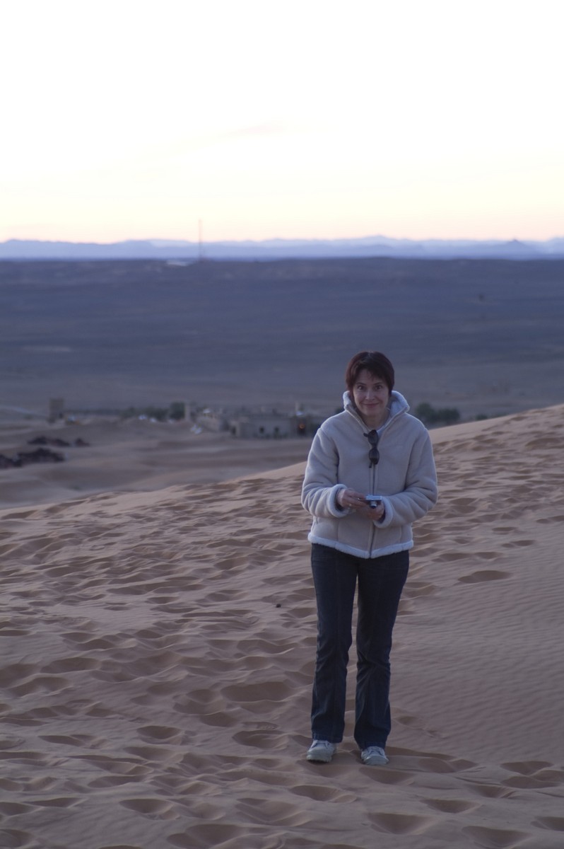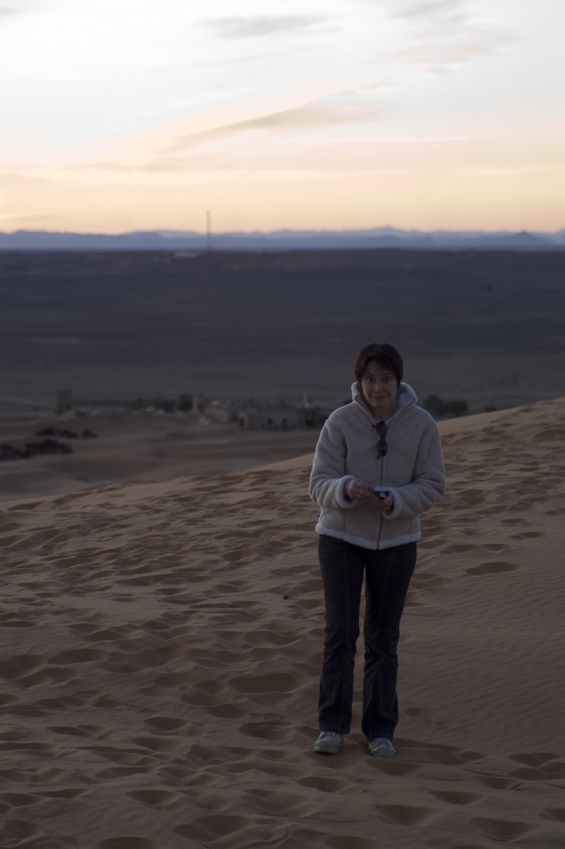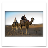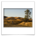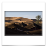 5ème jour - TINEGHIR/ERFOUD/MERZOUGA : Départ pour Erfoud via Tinejdad, Goulmima, Errachidia et la magnifique vallée du Ziz, Rissani , petit village réputé pour son marché aux dattes et construit sur les ruines de Sijilmassa berceau de la dynastie régnante. Ensuite nous avons traversé le reg menant aux dunes de l'erg Chabbi pour le coucher de soleil. Nous nous sommes rendus sur les dunes à dos de dromadaire. Dîner et logement sous tentes nomades au pied des dunes.