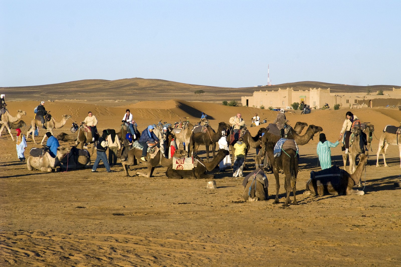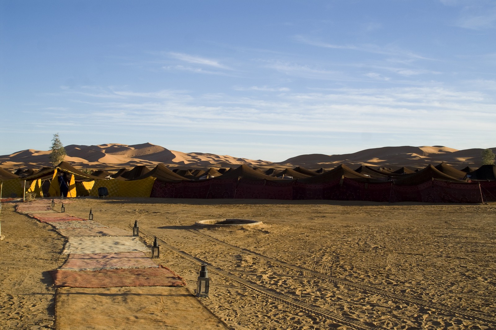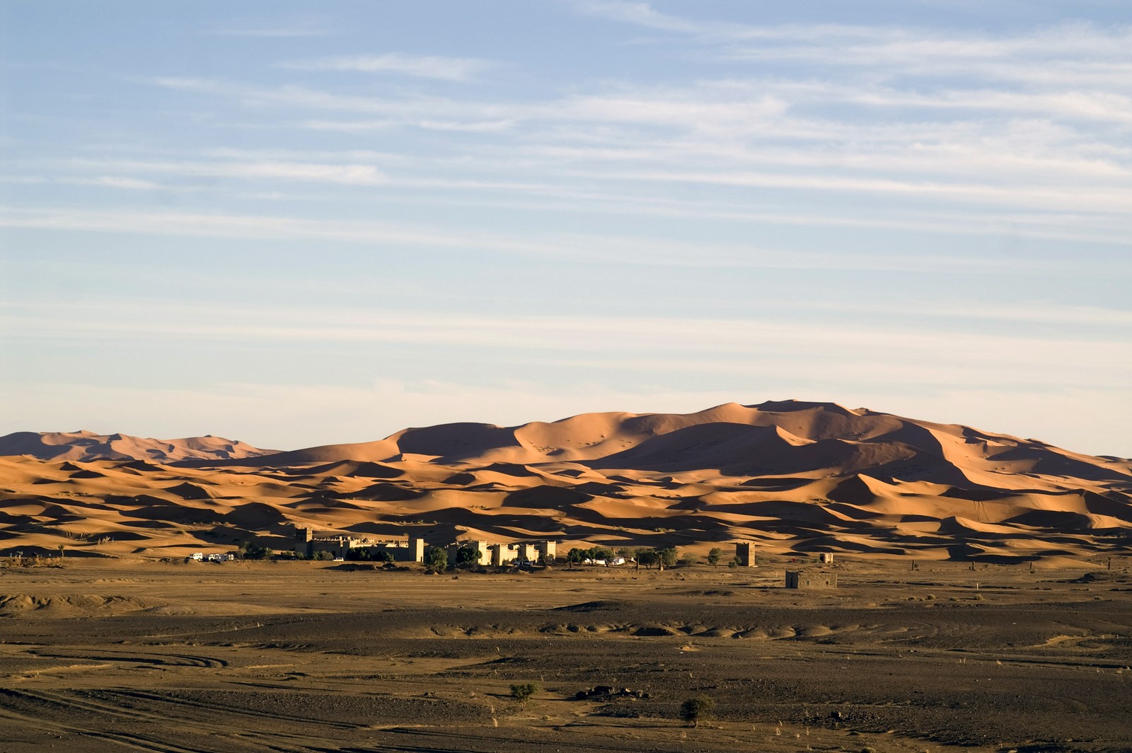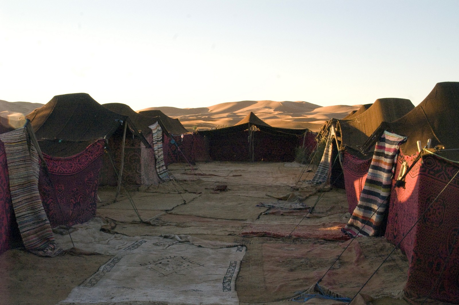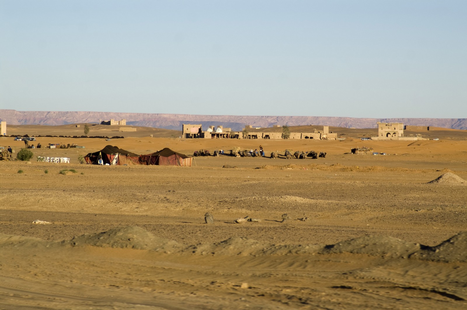 5ème jour - TINEGHIR/ERFOUD/MERZOUGA : Départ pour Erfoud via Tinejdad, Goulmima, Errachidia et la magnifique vallée du Ziz, Rissani , petit village réputé pour son marché aux dattes et construit sur les ruines de Sijilmassa berceau de la dynastie régnante. Ensuite nous avons traversé le reg menant aux dunes de l'erg Chabbi pour le coucher de soleil. Nous nous sommes rendus sur les dunes à dos de dromadaire. Dîner et logement sous tentes nomades au pied des dunes.