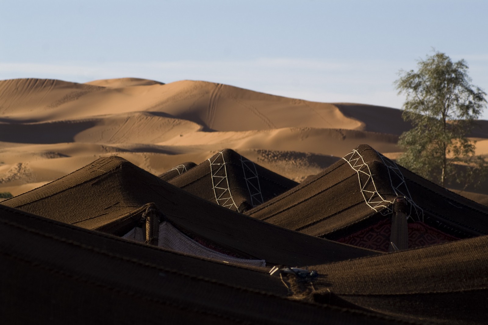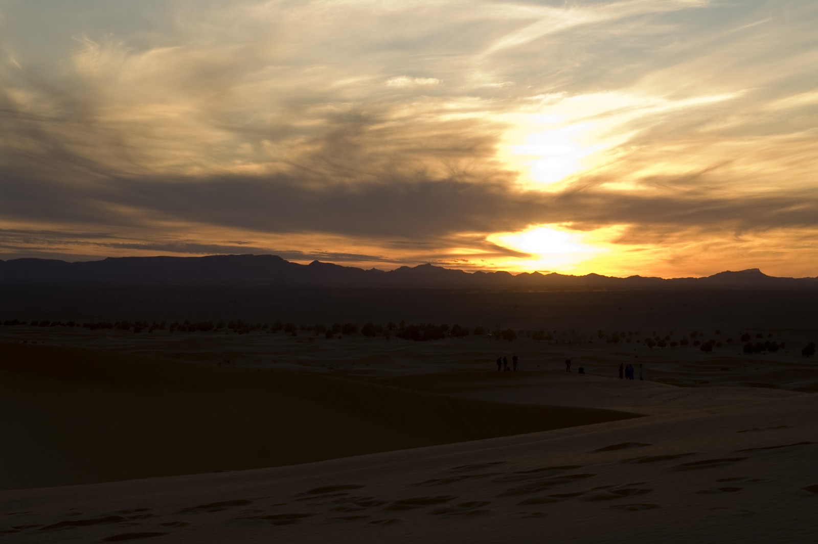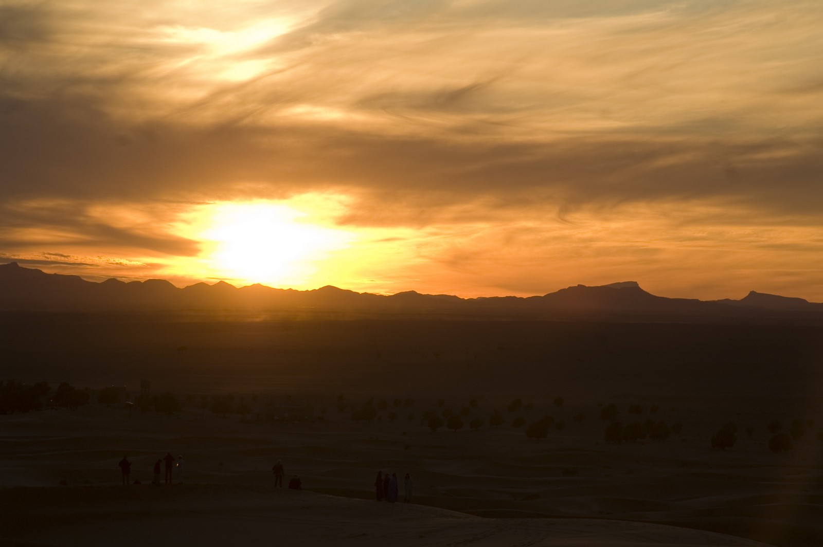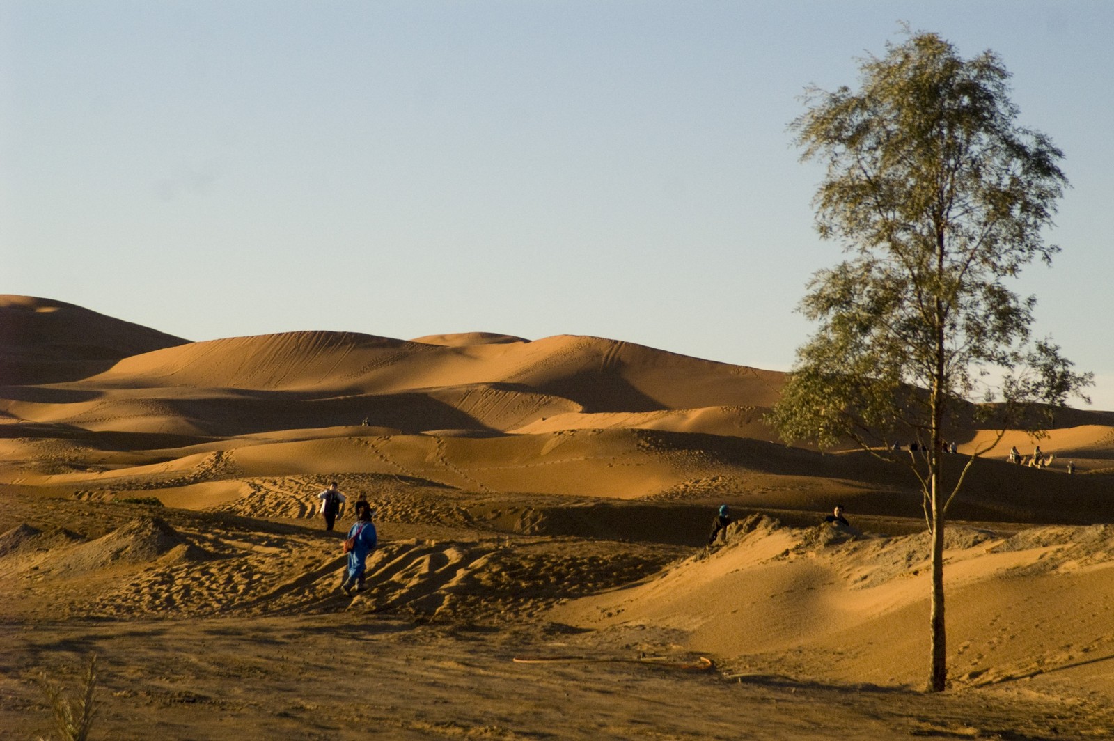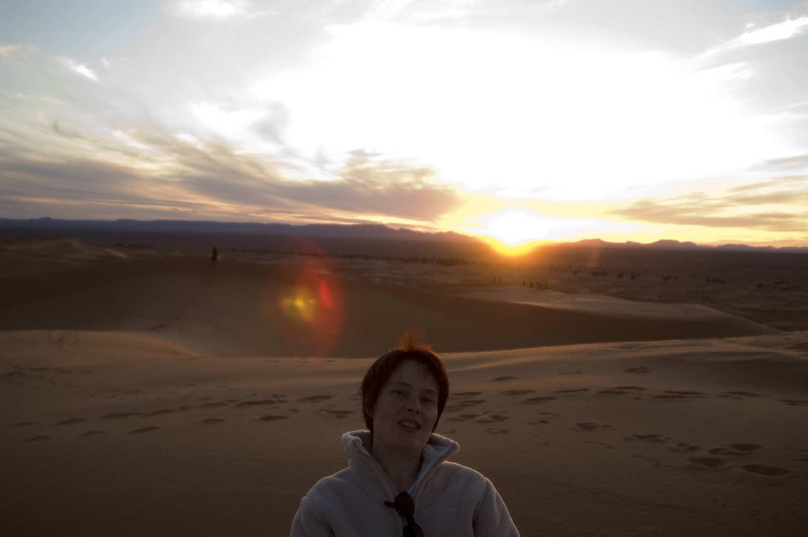 5ème jour - TINEGHIR/ERFOUD/MERZOUGA : Départ pour Erfoud via Tinejdad, Goulmima, Errachidia et la magnifique vallée du Ziz, Rissani , petit village réputé pour son marché aux dattes et construit sur les ruines de Sijilmassa berceau de la dynastie régnante. Ensuite nous avons traversé le reg menant aux dunes de l'erg Chabbi pour le coucher de soleil. Nous nous sommes rendus sur les dunes à dos de dromadaire. Dîner et logement sous tentes nomades au pied des dunes.